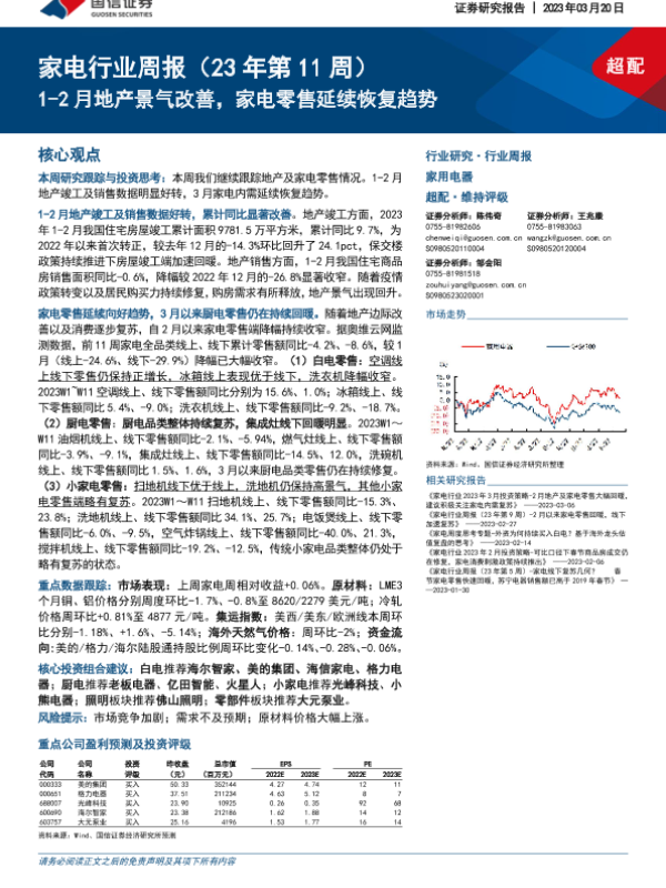 【国信证券】【20230320】家电行业周报(23年第11周):1-2月地产景气改善,家电零售延续恢复趋势-16页 行业研究
