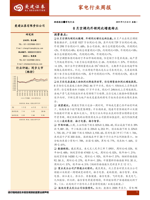 【爱建证券】【20190923】家电行业周报:8月空调内外销同比增速转正-11页 行业研究
