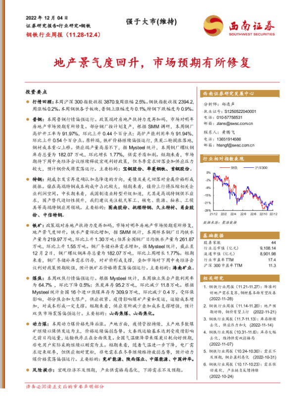 【西南证券】【20221204】钢铁行业周报:地产景气度回升,市场预期有所修复-16页 行业研究