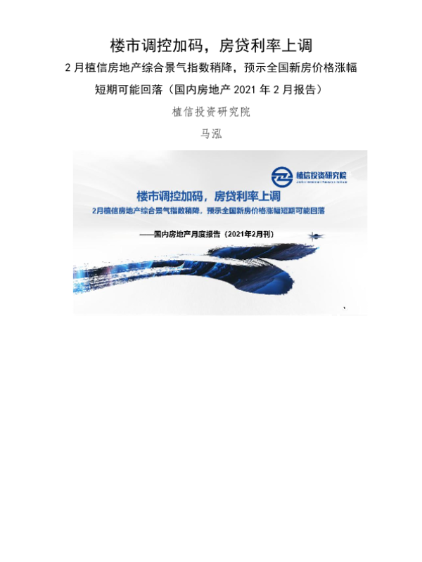 【植信投资】【20210312】国内房地产2021年2月报告:楼市调控加码,房贷利率上调-2月房地产综合景气指数稍降,预示全国新房价格涨幅短期可能回落-9页 行业研究