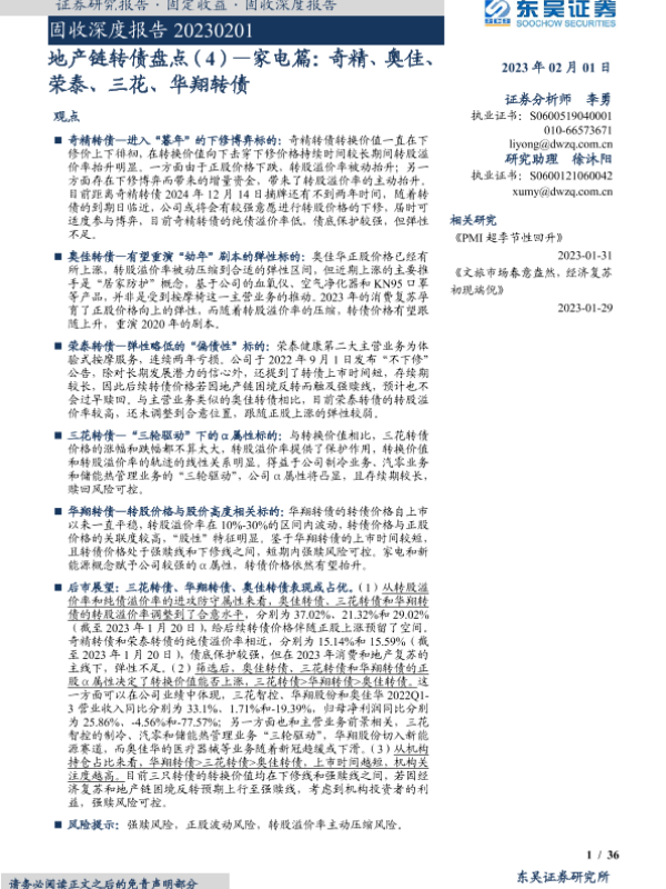 【东吴证券】【20230201】地产链转债盘点(4):家电篇,奇精、奥佳、荣泰、三花、华翔转债-36页 行业研究