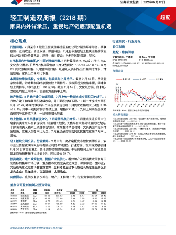 【国信证券】【20220919】轻工制造行业双周报(2218期):家具内外销承压,重视地产链底部配置机遇-22页 行业研究