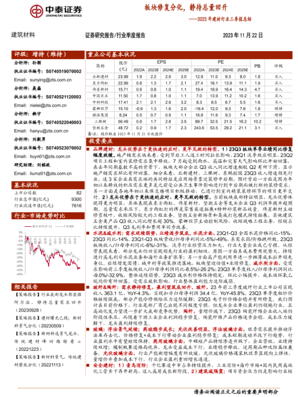 【中泰证券】【20231123】2023年建材行业三季报总结-板块修复分化-静待总量回升-51页 行业研究