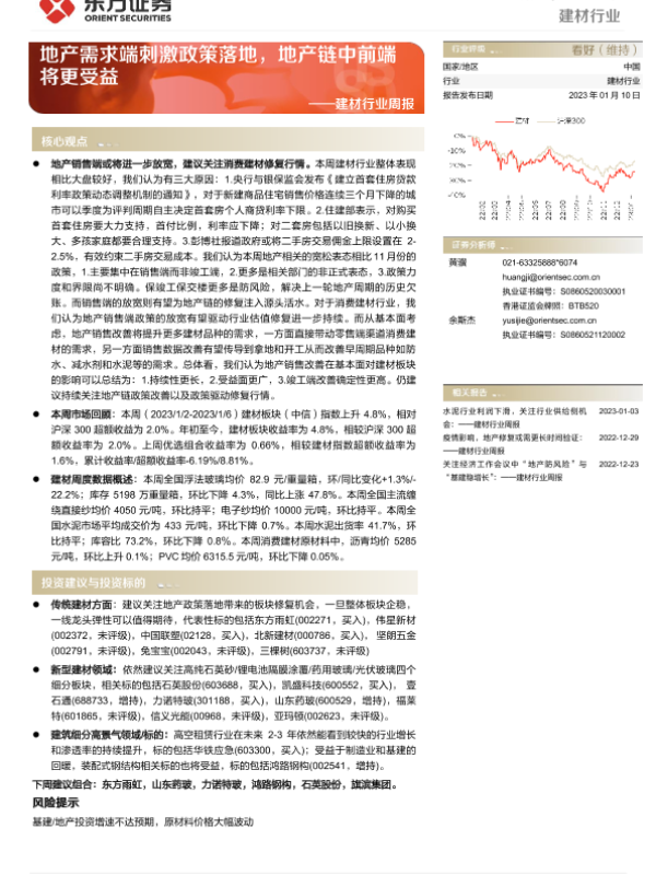 【东方证券】【20230110】20230110-东方证券-建材行业周报_地产需求端刺激政策落地_地产链中前端将更受益-22页 行业研究