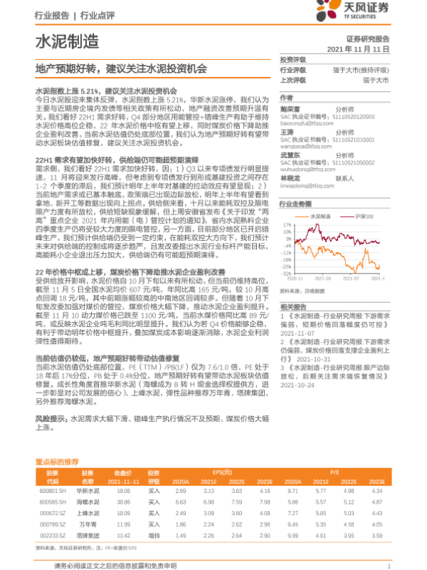 【天风证券】【20211111】水泥制造:地产预期好转,建议关注水泥投资机会-2页 行业研究