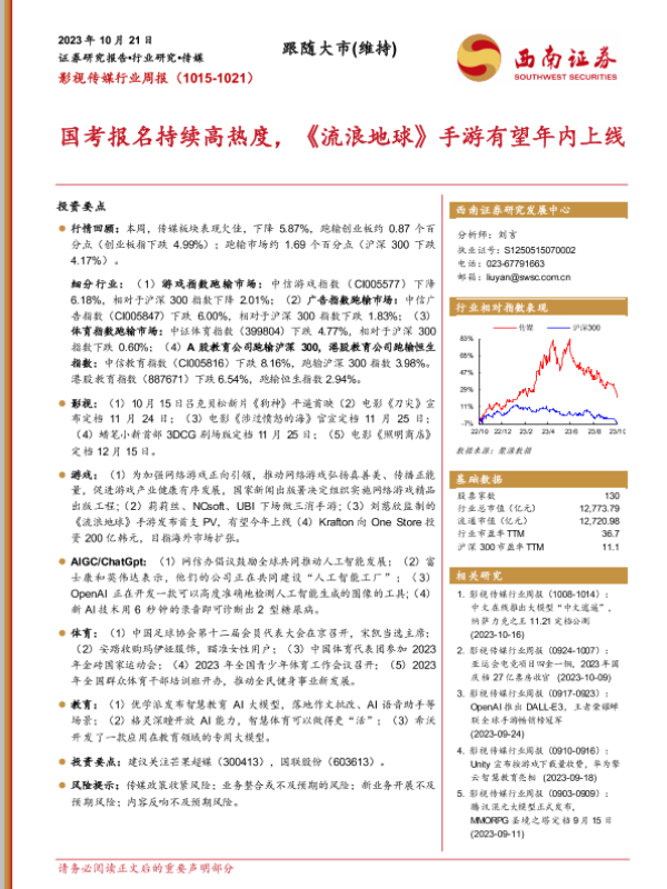 【西南证券】【20231021】影视传媒行业周报:国考报名持续高热度,《流浪地球》手游有望年内上线-20页 行业研究
