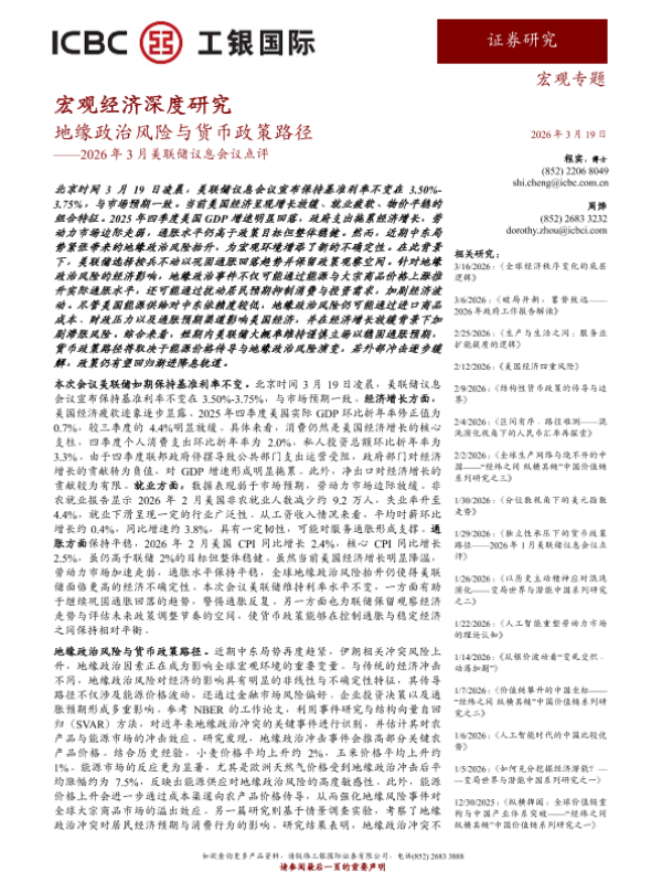 【工银国际证券有限公司】【202603】地缘政治风险与货币政策路径——2026年3月美联储议息会议点评-4页 证券期货研究报告