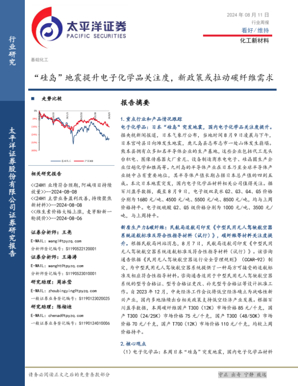 【太平洋证券】【20240811】20240811-太平洋-化工新材料行业周报:“硅岛”地震提升电子化学品关注度,新政策或拉动碳纤维需求-41页 行业研究