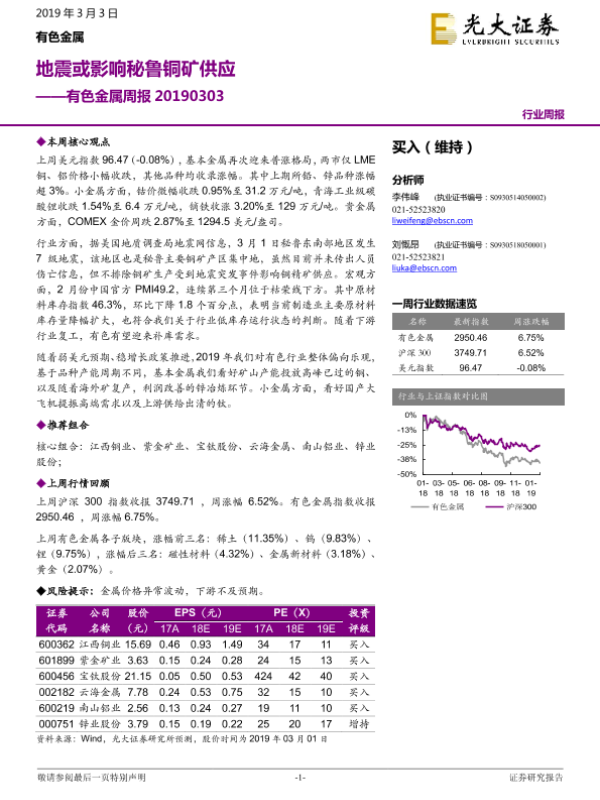 【光大证券】【20190303】20190303-光大证券-有色金属周报:地震或影响秘鲁铜矿供应-15页 行业研究