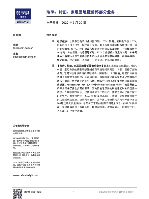 【莫尼塔研究】【20220320】电子周报:瑞萨、村田、索尼因地震暂停部分业务-5页 行业研究
