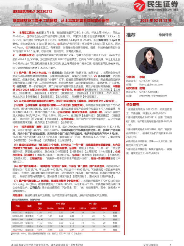 【民生证券】【20230212】建材建筑周观点:家装建材复工快于工地建材,从土耳其地震看减隔震必要性-26页 行业研究