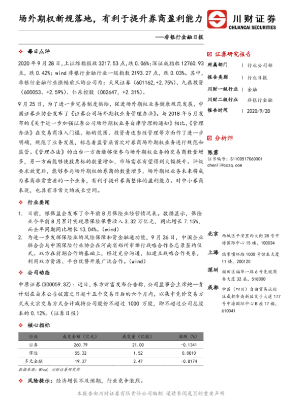 【川财证券】【20200928】非银行金融日报:场外期权新规落地,有利于提升券商盈利能力-2页 证券期货研究报告