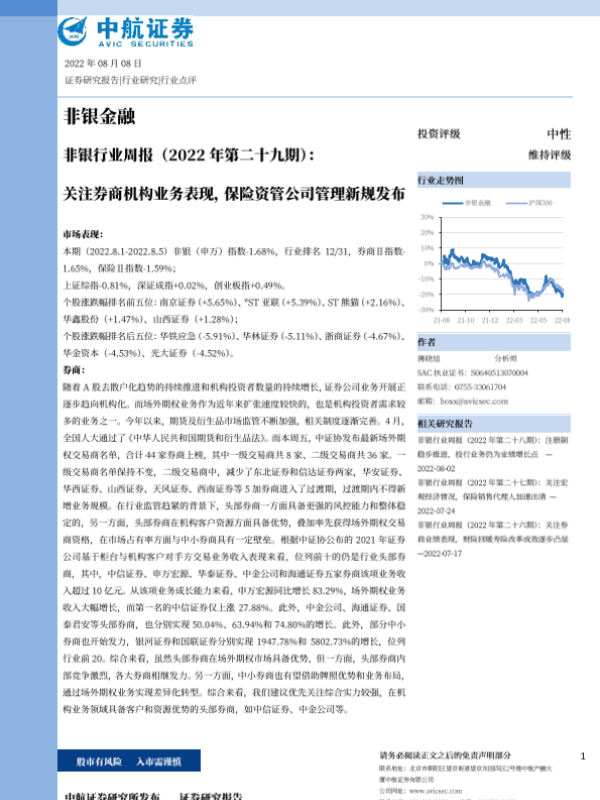 【中航证券】【20220808】非银行业周报:关注券商机构业务表现,保险资管公司管理新规发布-12页 行业研究