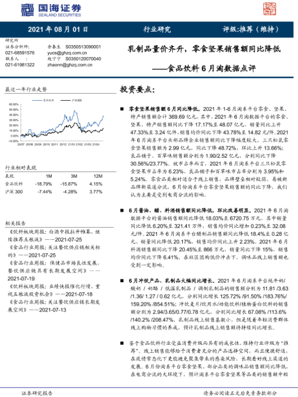 【国海证券】【20210801】食品饮料6月淘数据点评:乳制品量价齐升,零食坚果销售额同比降低-48页 行业研究