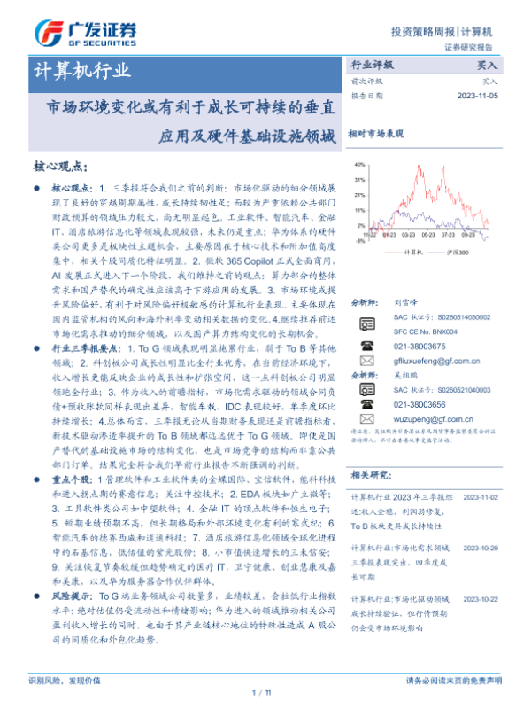 【广发证券】【20231105】20231105-广发证券-计算机行业投资策略周报:市场环境变化或有利于成长可持续的垂直应用及硬件基础设施领域-11页 行业研究