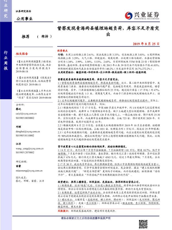 【兴业证券】【20190825】督察发现青海两县填埋场超负荷,库容不足矛盾突出-12页 行业研究
