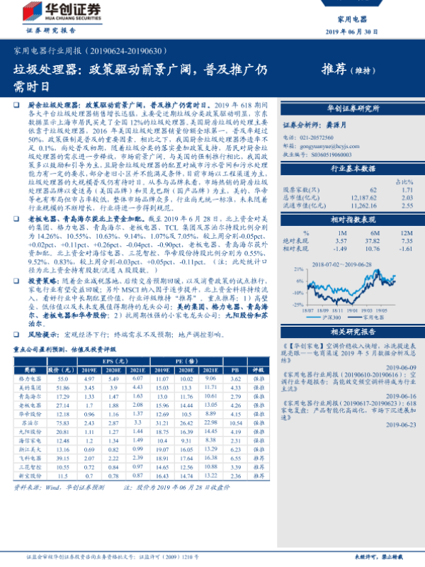 【华创证券】【20190630】家用电器行业周报:垃圾处理器:政策驱动前景广阔,普及推广仍需时日-16页 行业研究