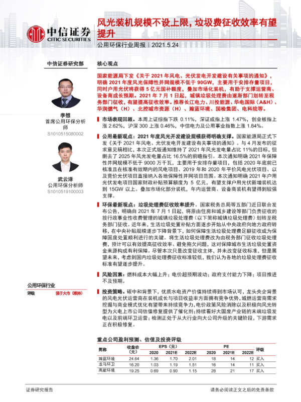 【中信证券】【20210524】公用环保行业周报:风光装机规模不设上限,垃圾费征收效率有望提升-9页 行业研究