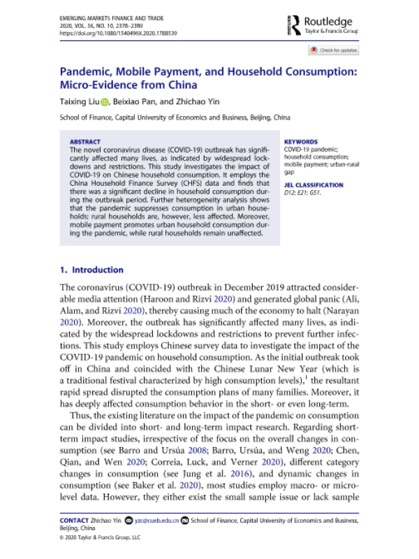 【Taylor & Francis出版社】【202103】Pandemic, Mobile Payment, and Household Consumption Micro-Evidence from China-13页 学术论文