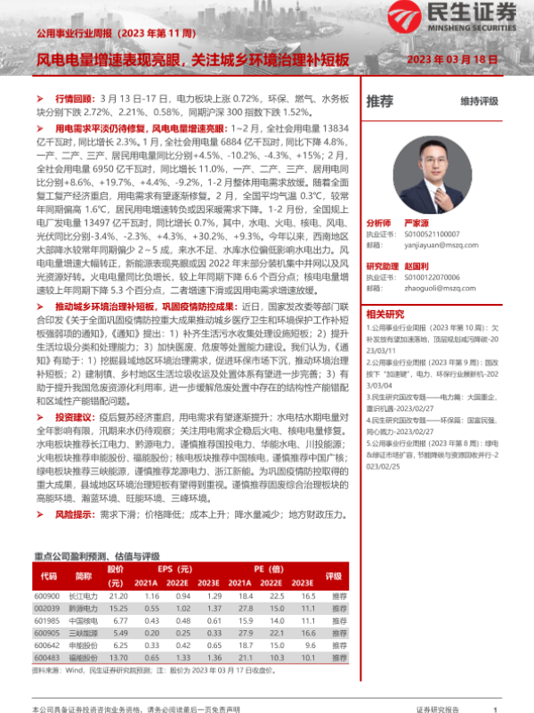 【民生证券】【20230318】公用事业行业周报:风电电量增速表现亮眼,关注城乡环境治理补短板-25页 行业研究