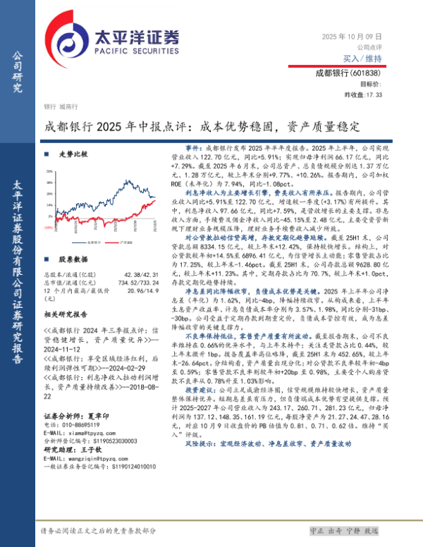 【太平洋证券】【202510】成都银行2025年中报点评:成本优势稳固,资产质量稳定-4页 证券期货研究报告