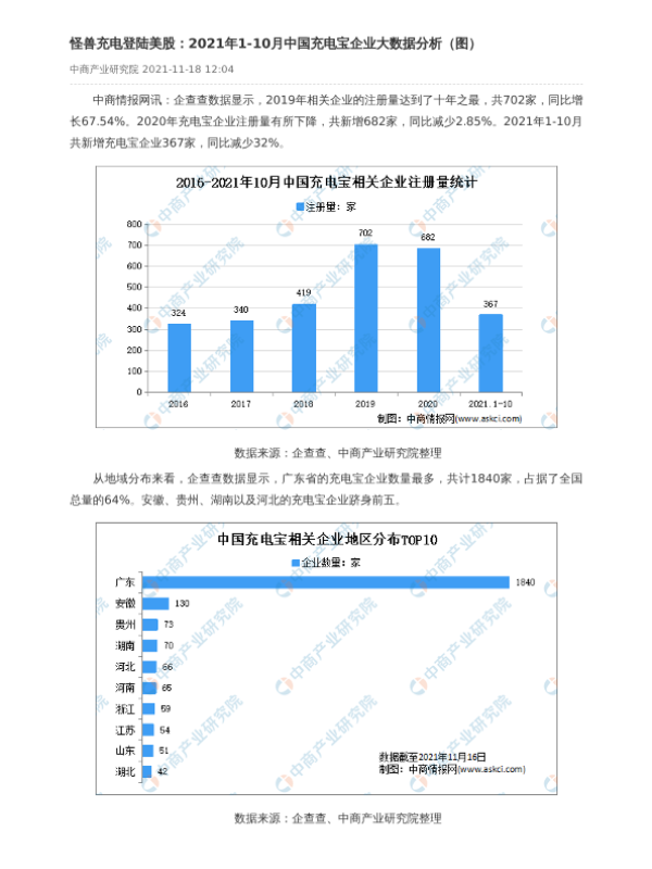 【中商产业研究院】【20211118】怪兽充电登陆美股:2021年1-10月中国充电宝企业大数据分析-2页 行业研究