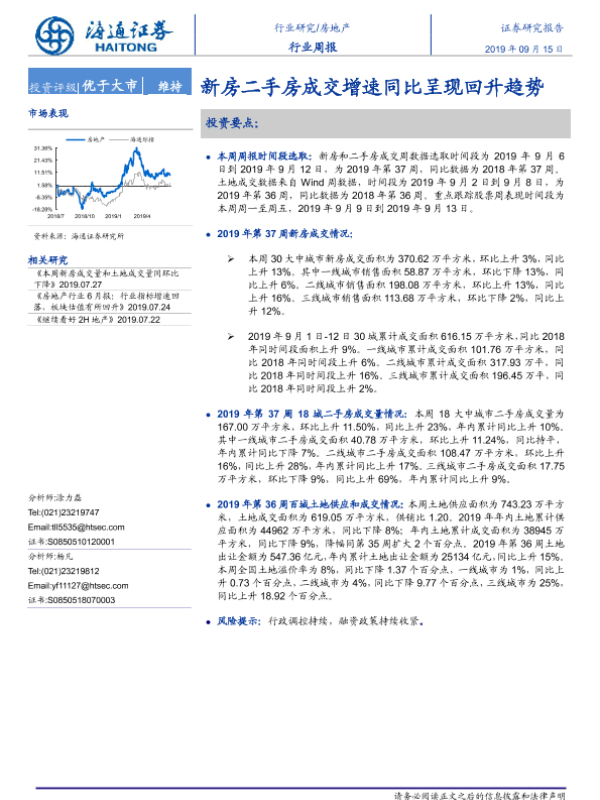 【海通证券】【20190915】房地产行业周报:新房二手房成交增速同比呈现回升趋势-6页 行业研究