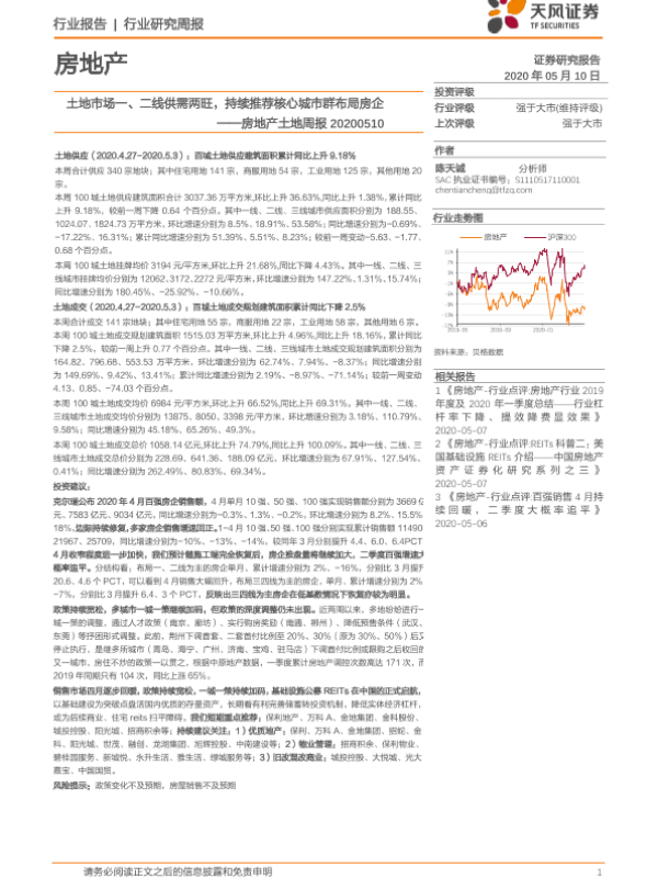 【天风证券】【20200510】土地市场一、二线供需两旺,持续推荐核心城市群布局房企-9页 行业研究