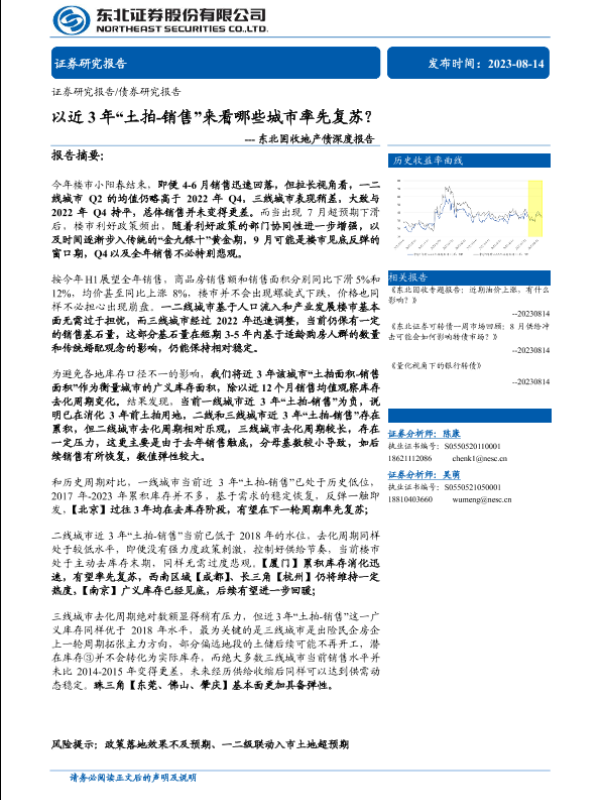 【东北证券】【20230814】固收地产债深度报告:以近3年“土拍_销售”来看哪些城市率先复苏?-30页 行业研究