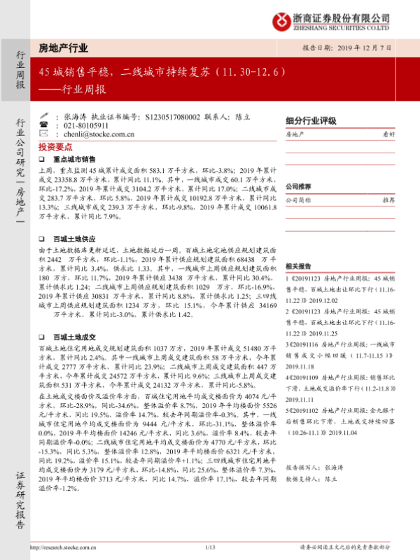 【浙商证券】【20191207】45城销售平稳,二线城市持续复苏-13页 行业研究