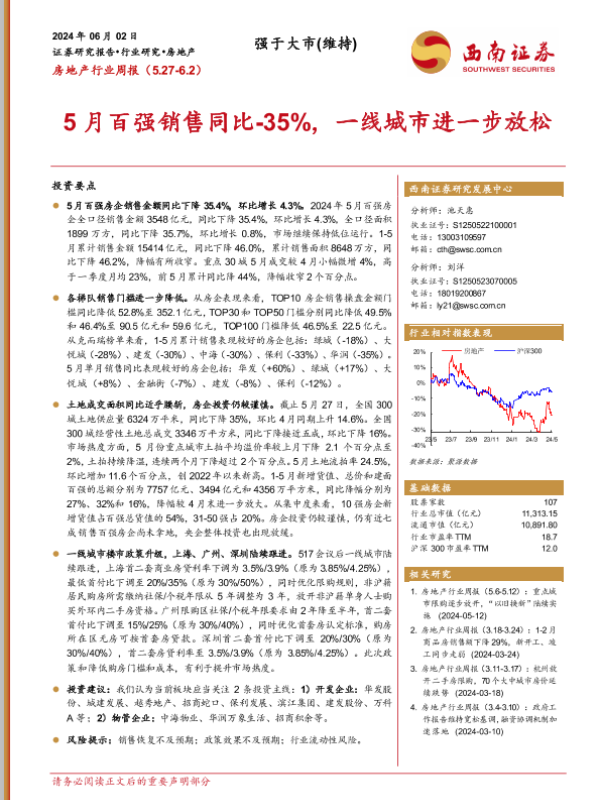 【西南证券】【20240602】5月百强销售同比-35%,一线城市进一步放松-15页 行业研究