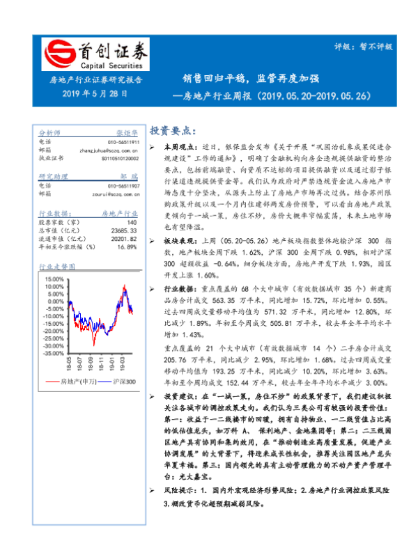 【首创证券】【20190528】房地产行业周报:销售回归平稳,监管再度加强-14页 行业研究
