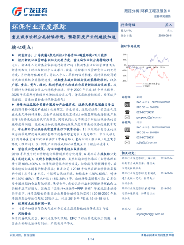 【广发证券】【20190811】环保行业深度跟踪:重点城市垃圾分类持续推进,预期固废产业链建设加速-14页 行业研究