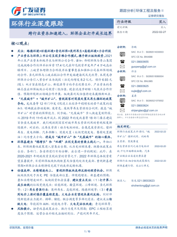 【广发证券】【20220227】环保行业深度跟踪:跨行业资本加速进入,环保企业打开成长边界-10页 行业研究