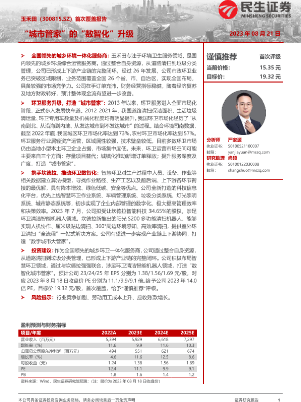 【民生证券】【20230821】玉禾田(300815.SZ)首次覆盖报告:“城市管家”的“数智化”升级-28页 行业研究