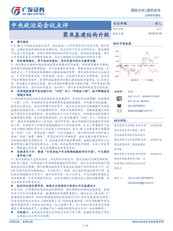 【广发证券】【20190730】建筑装饰跟踪分析:中央政治局会议点评-聚焦基建结构升级-4页 行业研究