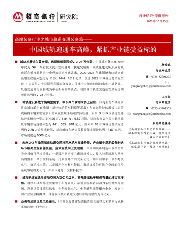 【招商银行】【20201015】高端装备行业之城市轨道交通装备篇:中国城轨迎通车高峰,紧抓产业链受益标的-18页 行业研究