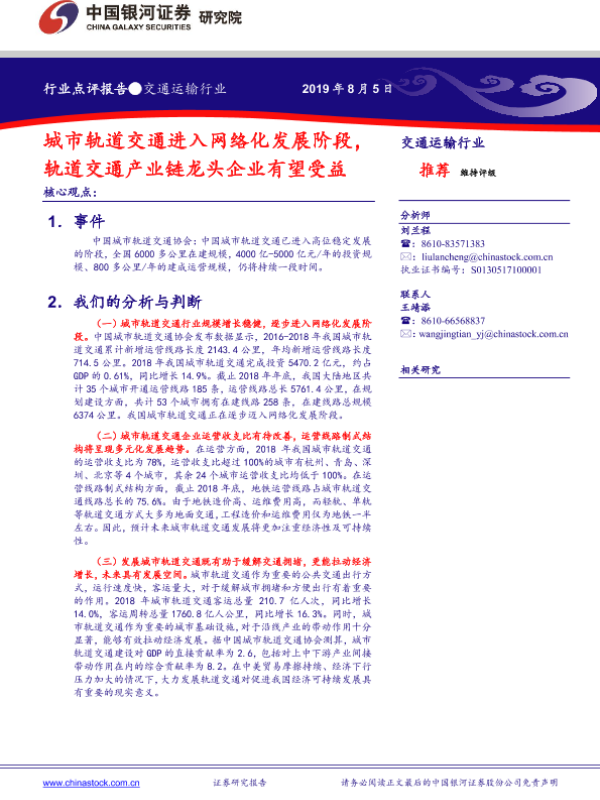 【银河证券】【20190805】城市轨道交通进入网络化发展阶段,轨道交通产业链龙头企业有望受益-4页 行业研究