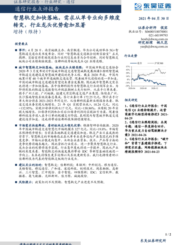【东吴证券】【20210430】通信行业点评报告:智慧轨交加快落地,需求从单专业向多维度转变,行业龙头优势愈加显著-2页 行业研究