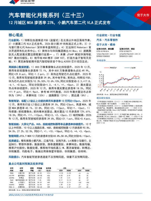 【国信证券】【202603】汽车行业智能化月报系列(三十三):12月城区NOA渗透率23% 小鹏汽车第二代VLA正式发布-64页 证券期货研究报告