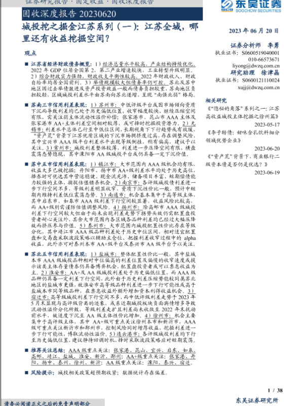【东吴证券】【20230620】城投挖之掘金江苏系列(一):江苏全域,哪里还有收益挖掘空间?-38页 行业研究