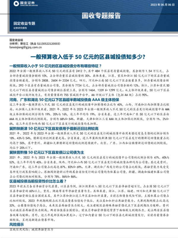 【国金证券】【20230606】固收专题报告:一般预算收入低于50亿元的区县城投债知多少?-15页 行业研究