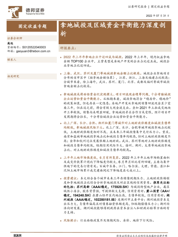 【德邦证券】【20220731】固定收益专题:拿地城投及区域资金平衡能力深度剖析-21页 行业研究
