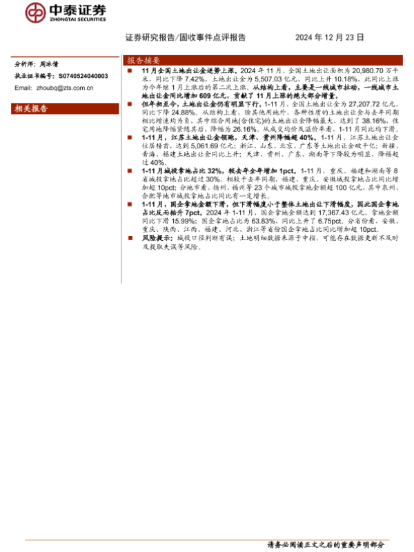 【中泰证券】【20241223】11月土地市场有哪些变化?-12页 行业研究