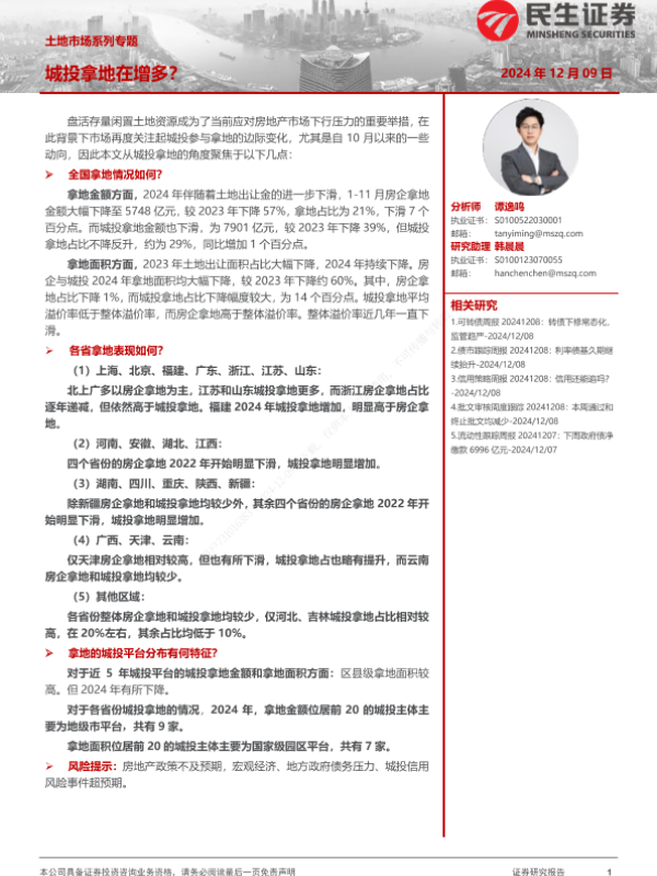【民生证券】【20241209】土地市场系列专题:城投拿地在增多-26页 行业研究