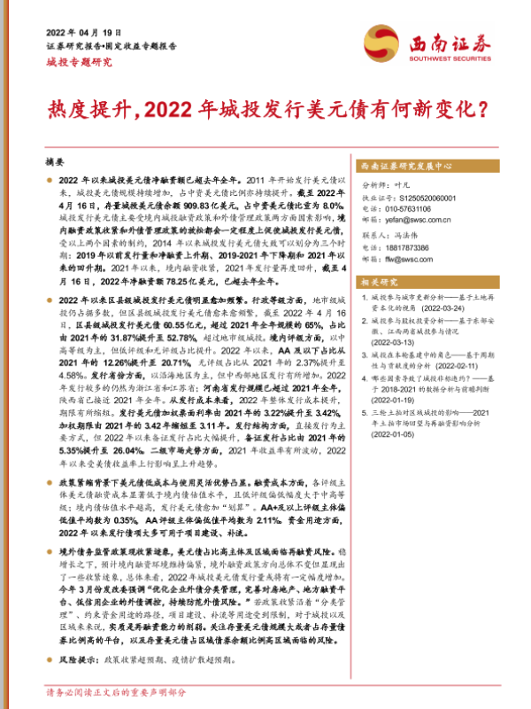 【西南证券】【20220419】城投专题研究:热度提升,2022年城投发行美元债有何新变化?-18页 行业研究