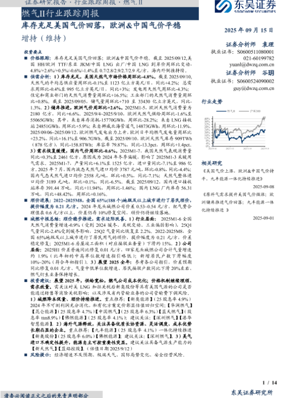 【东吴证券】【202509】燃气Ⅱ行业跟踪周报·库存充足美国气价回落,欧洲&中国气价平稳-14页 证券期货研究报告