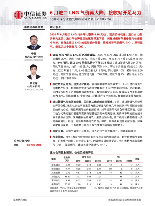 【中信证券】【20200724】6月进口LNG气价再大降,接收站开足马力-5页 行业研究