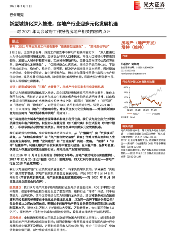 【光大证券】【20210305】对2021年两会政府工作报告房地产相关内容的点评:新型城镇化深入推进,房地产行业迎多元化发展机遇-2页 行业研究
