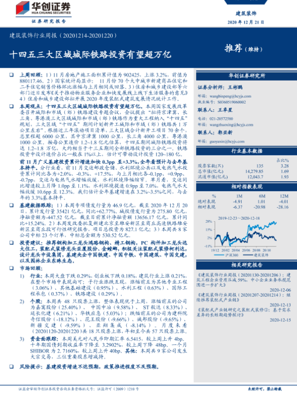 【华创证券】【20201221】建筑装饰行业周报:十四五三大区域城际铁路投资有望超万亿-20页 行业研究